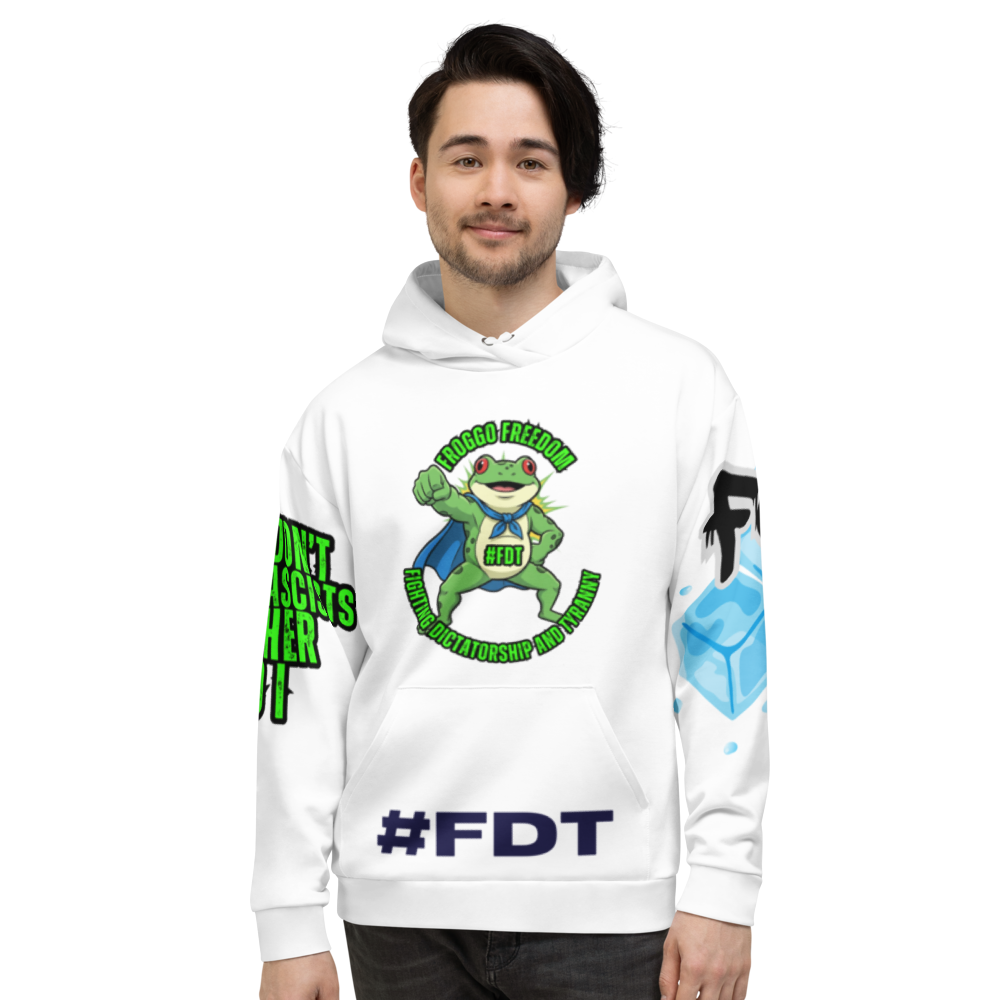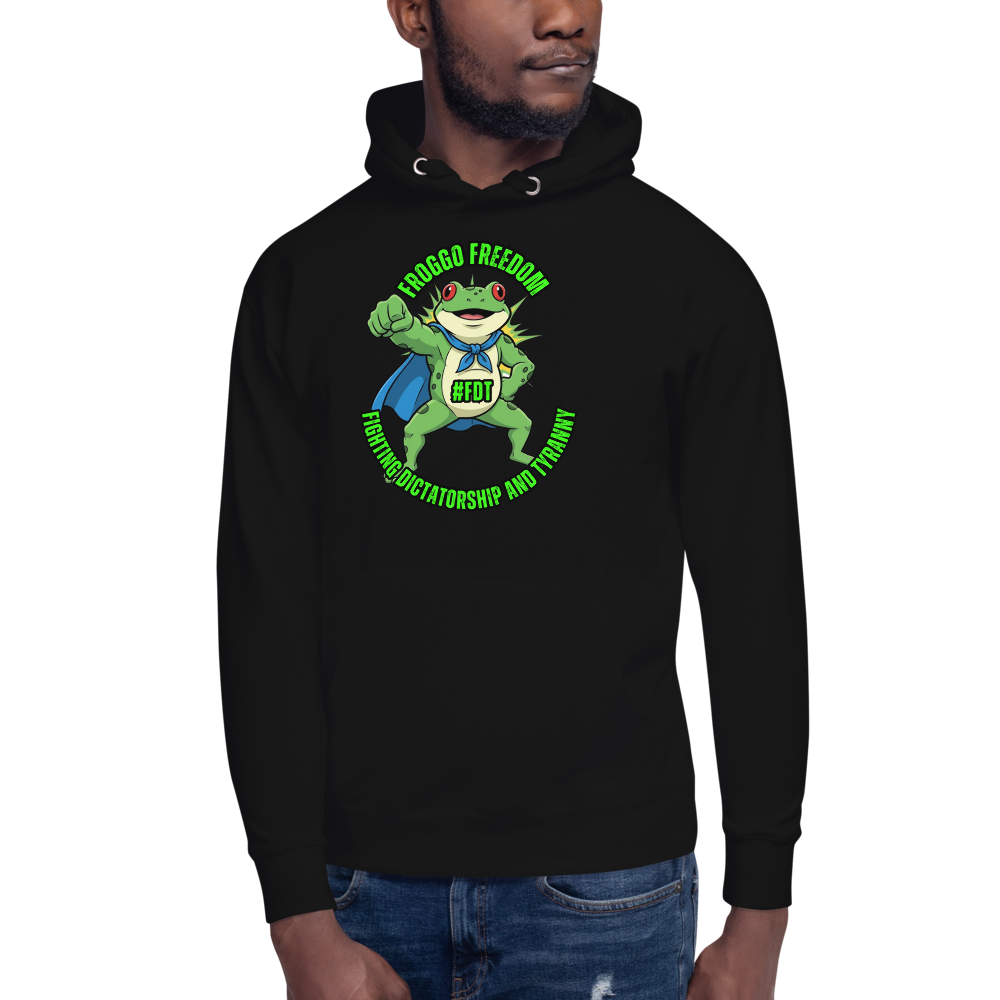Wrap yourself in rebellion (and comfort) with the Froggo Freedom Tagged-Up Hoodie — featuring our fearless hero Froggo Freedom, proudly standing #FDT and leaping against dictatorship, tyranny, and all things slimy. 🐸✊ Cozy on the inside, bold on the outside, this hoodie is perfect for those who prefer their fashion with a side of freedom and satire.