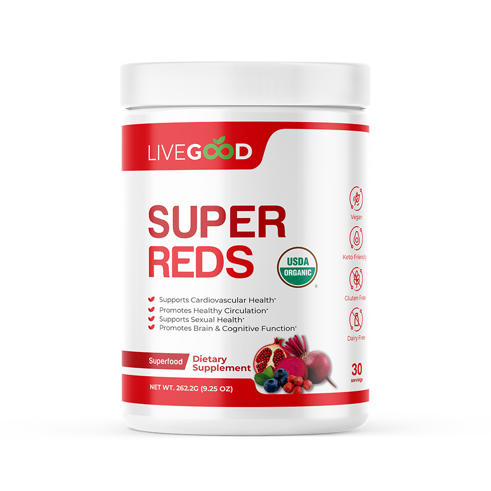 That's why LiveGood created Super Reds! Our Organic Super Reds contain the highest amount of fruit and vegetable extracts known to help improve blood flow by increasing our body's production of Nitric Oxide, boosting blood circulation, supporting brain and cognitive function, sexual health, heart health, immune function and helping to maximize your body's overall health!